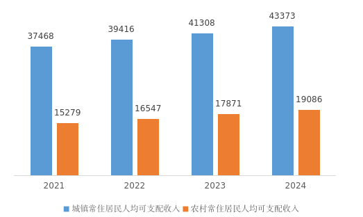 “十四五”期间,赤峰市城乡居民收入稳步增长,生活水平不断提高。城镇常住居民人均可支配收入由2020年的34770元提高到2024年的43373元,年均增长5.7%。随着农村经济的快速发展和惠农政策的全面实施,农村常住居民收入显著提高,城乡收入差距逐步缩小。农村居民人均可支配收入由2020年的13740元提高到2024年的19086元,年均增长8.6%。城乡居民收入之比由2020年的2.5:1降低到2024年的2.27:1。