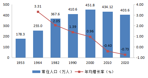 全市常住人口与2010年第六次全国人口普查的4341245人相比,减少305278人,减少7.03%,年平均增长率为-0.73%。