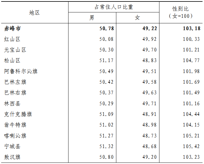 12个旗县区中,常住人口性别比在102以下的旗县区有6个,在102至104之间的旗县区有1个,在104以上的旗县区有5个。