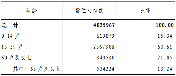 全市常住人口中,0-14岁[3]人口为619079人,占15.34%;15-59岁人口为2567308人,占63.61%;60岁及以上人口为849580人,占21.05%,其中65岁及以上人口为534224人,占13.24%。与2010年第六次全国人口普查相比,0-14岁人口的比重下降0.01个百分点,15-59岁人口的比重下降9.73个百分点,60岁及以上人口的比重上升9.74个百分点,65岁及以上人口的比重上升5.77个百分点。