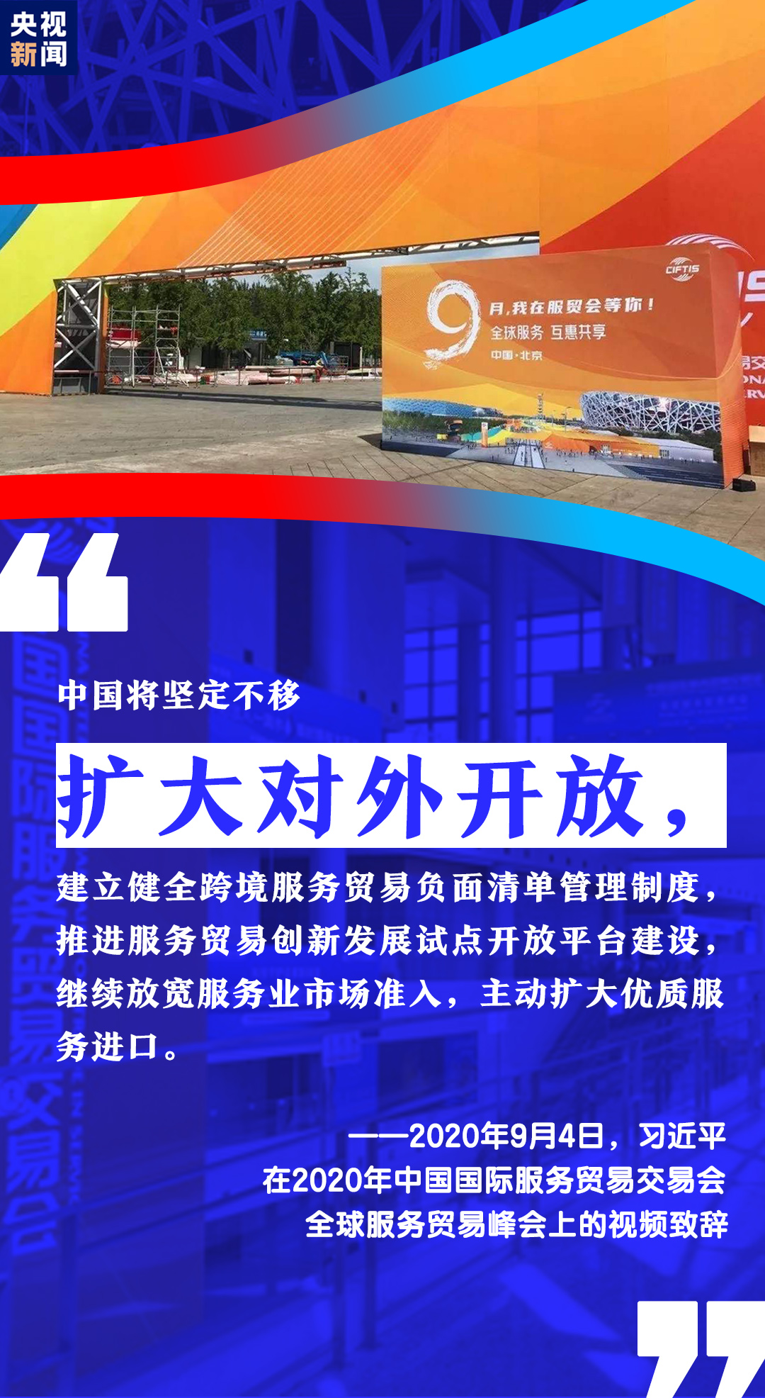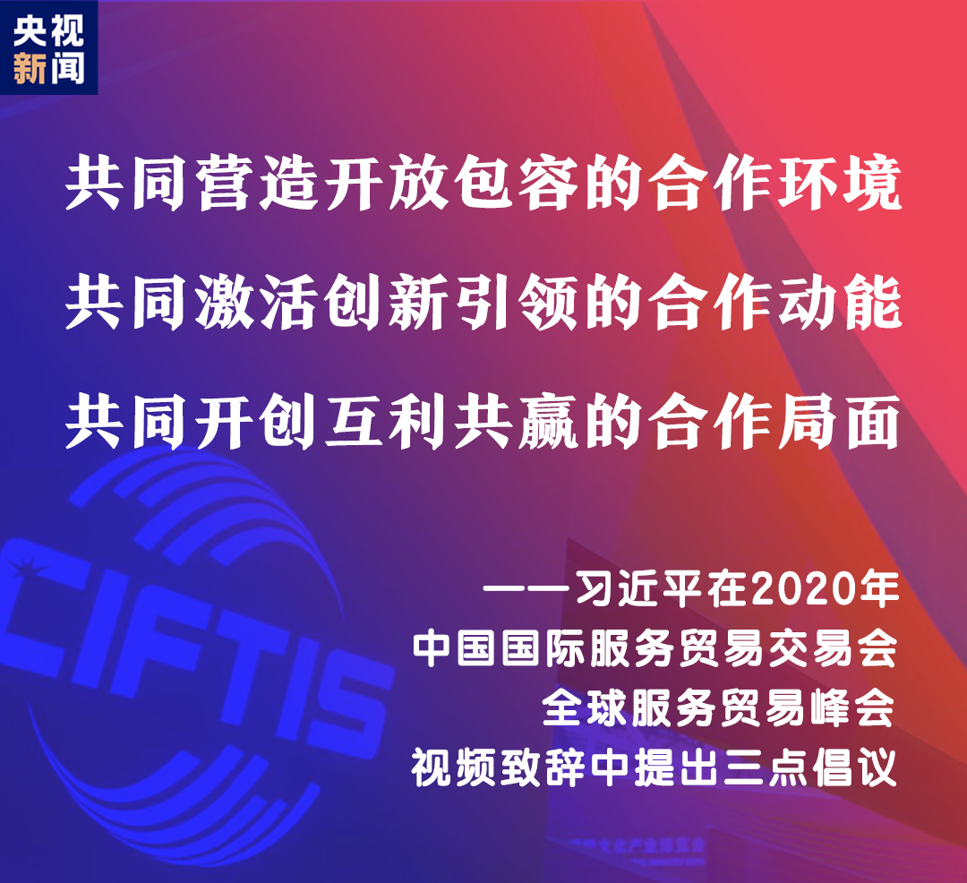 9月4日,2020年中国国际服务贸易交易会全球服务贸易峰会在北京开幕。习近平主席通过视频方式在峰会上致辞。