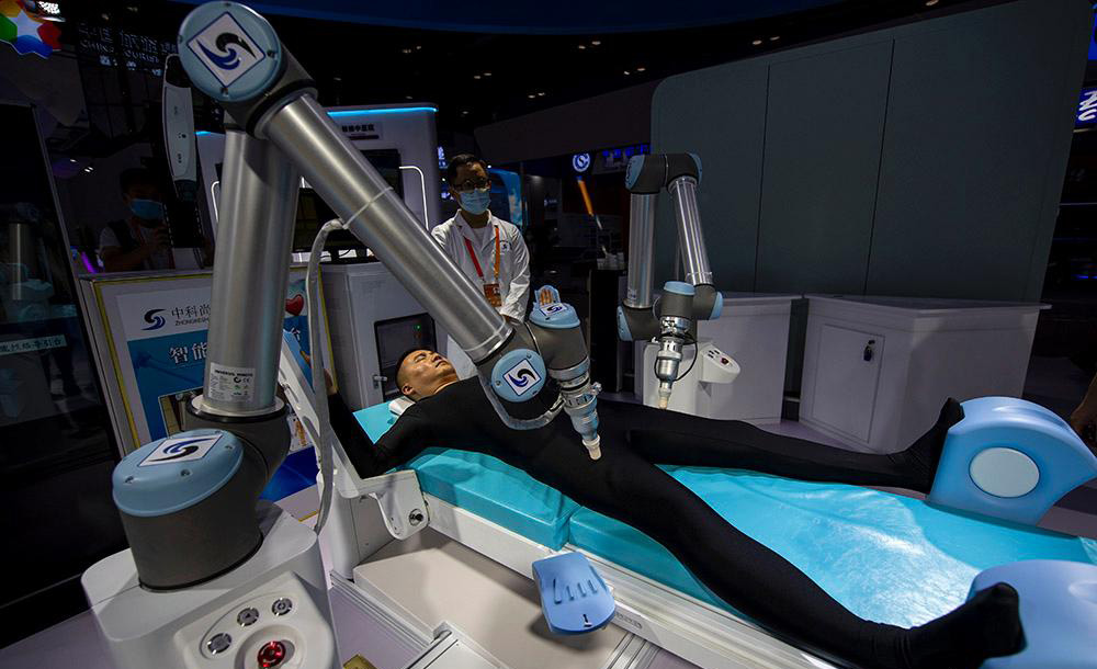 2020年服贸会综合展区,参观者正在体验中医智能经络导引机器人。